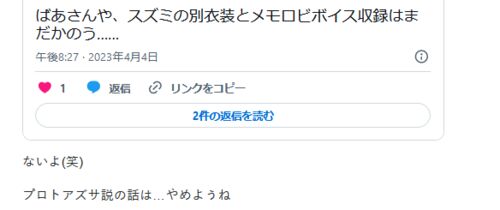 祝 理論値スズミ まじでうれし~ これから毎日カイテンジャーに閃光弾ぶつけような ばあさんや、スズミの別衣装とメモロビボイス収録はまだかのう…… — ふりすく@なたでここ商会 (@flisk1129) 2023年4月4日 ないよ(笑) プロトアズサ説の話は…やめようね ※ヘイ…